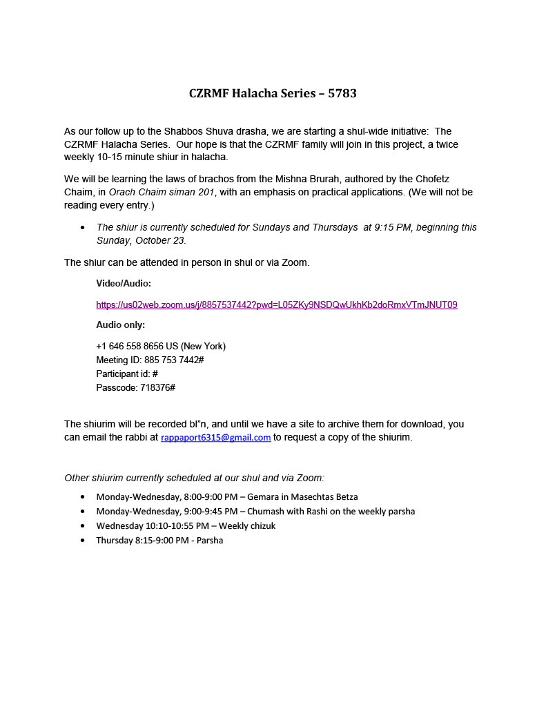 Start of twice-weekly (Mondays & Thursdays)10-15 minute shiur in halacha on Laws of Brochos.