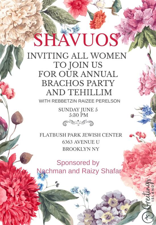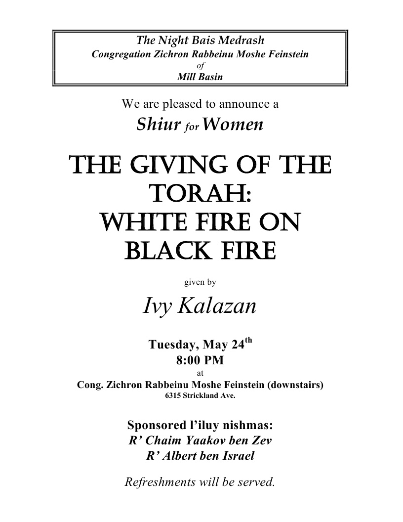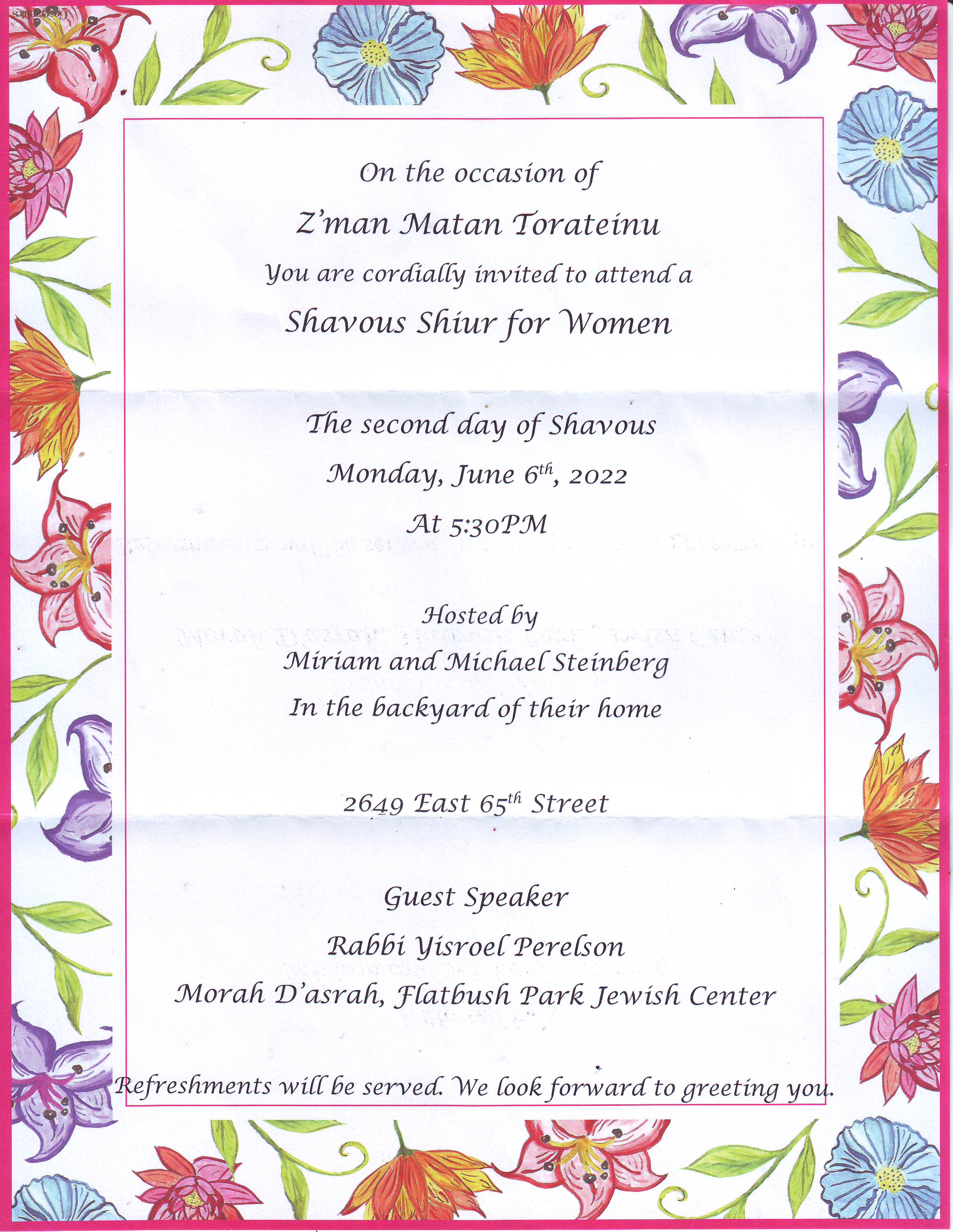 Monday, June 6, 2022, 5:30pm Shavuos Shiur for Women
