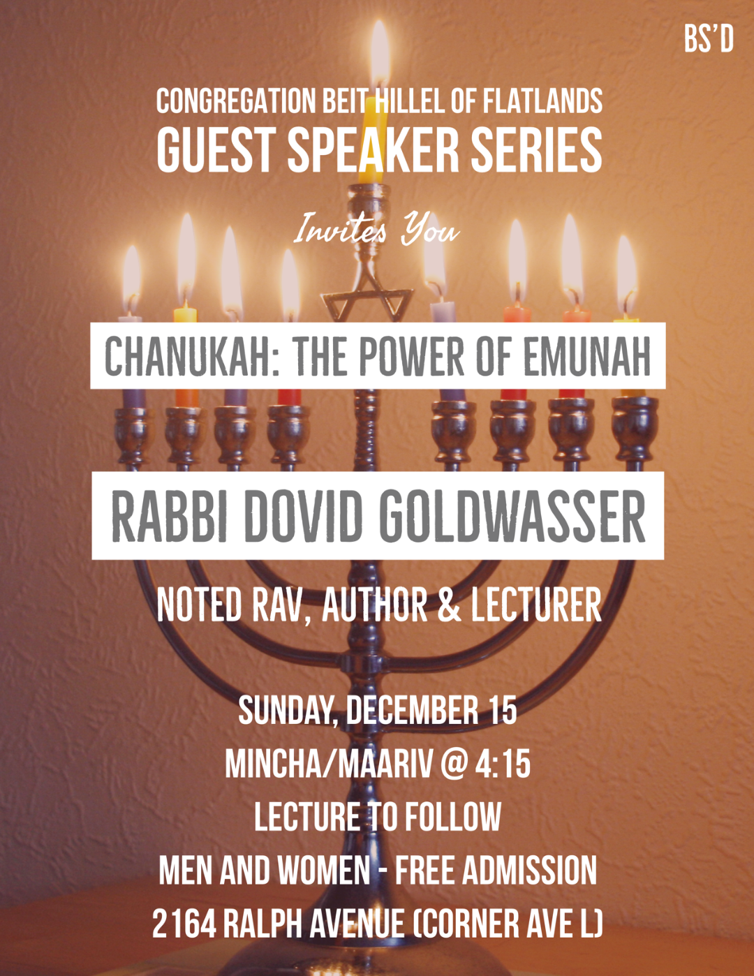 Mincha/Maariv at 4:15 PM, followed by lecture