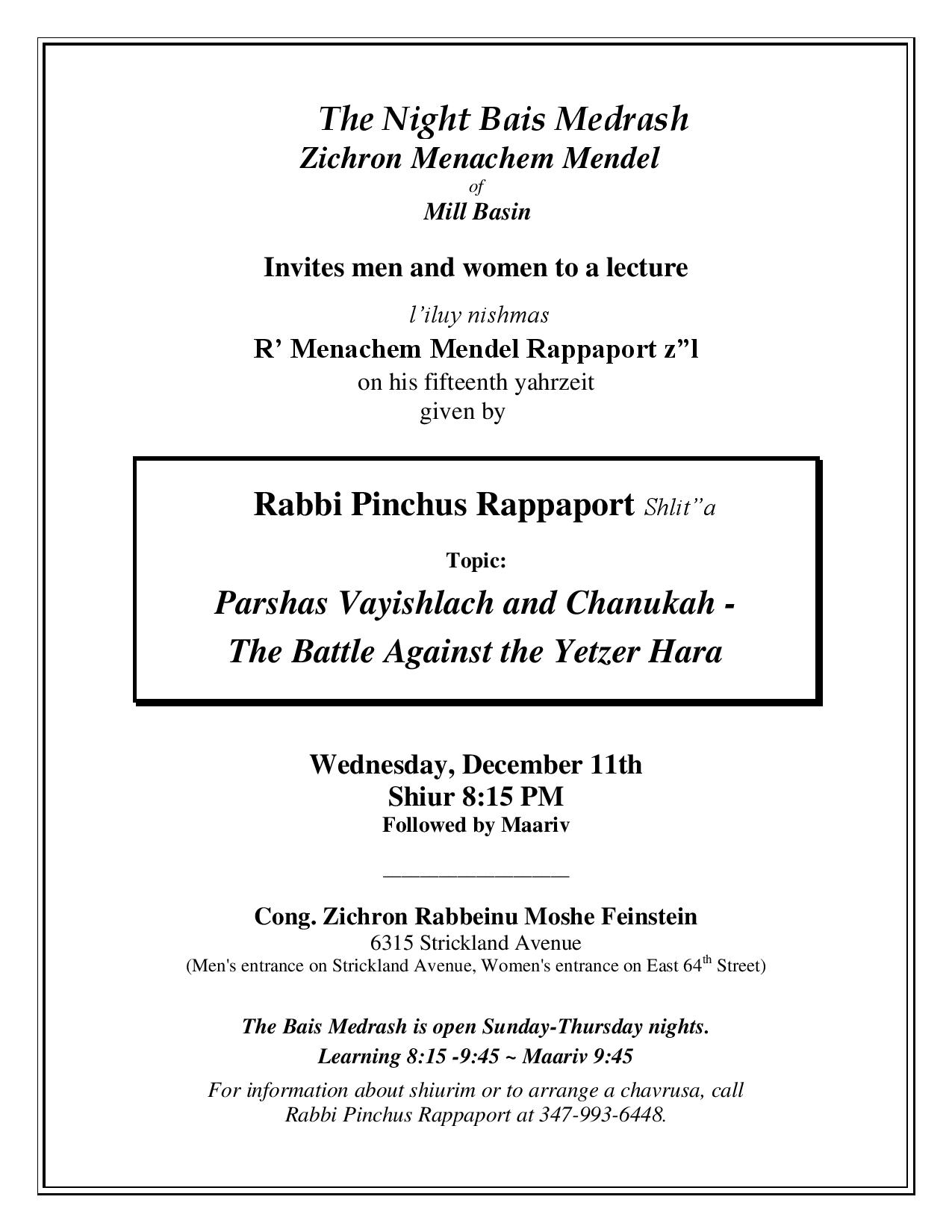 Topic: Parshas Vayishlach and Chanukah – The Battle Against the Yetzer Hara