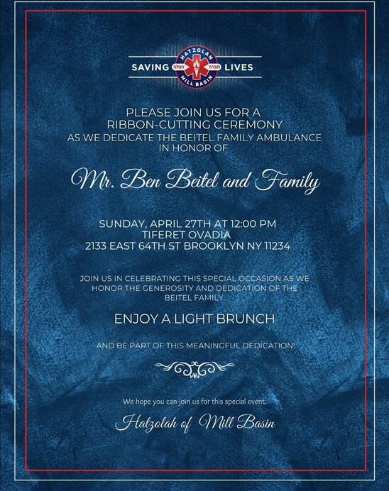 Sunday, April 27, 2025, 12:00pm Mill Basin Hatzolah Ambulance Dedication