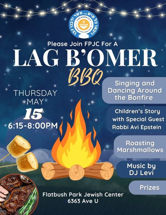 Thursday, May 15, 2025, 6:15pm - 8:00pm Lag B’Omer BBQ Flatbush Park Jewish Center