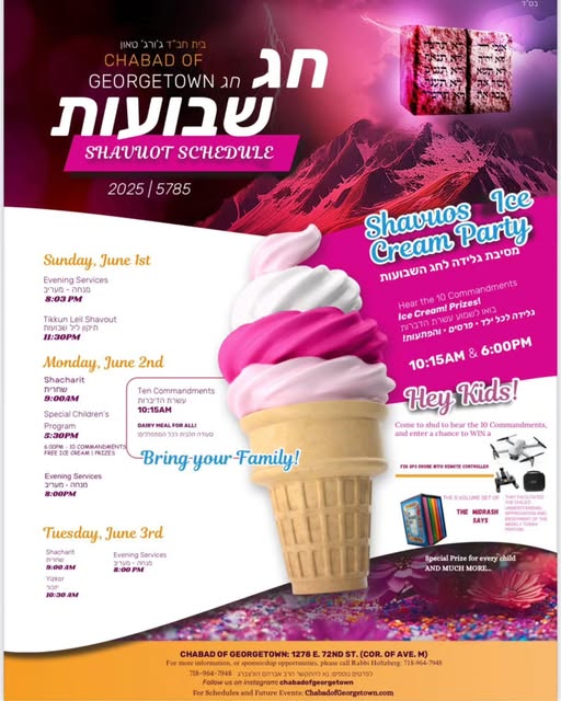 Monday, June 2, 2025, 10:15am Shavuos Ice Cream Party Chabad of Georgetown