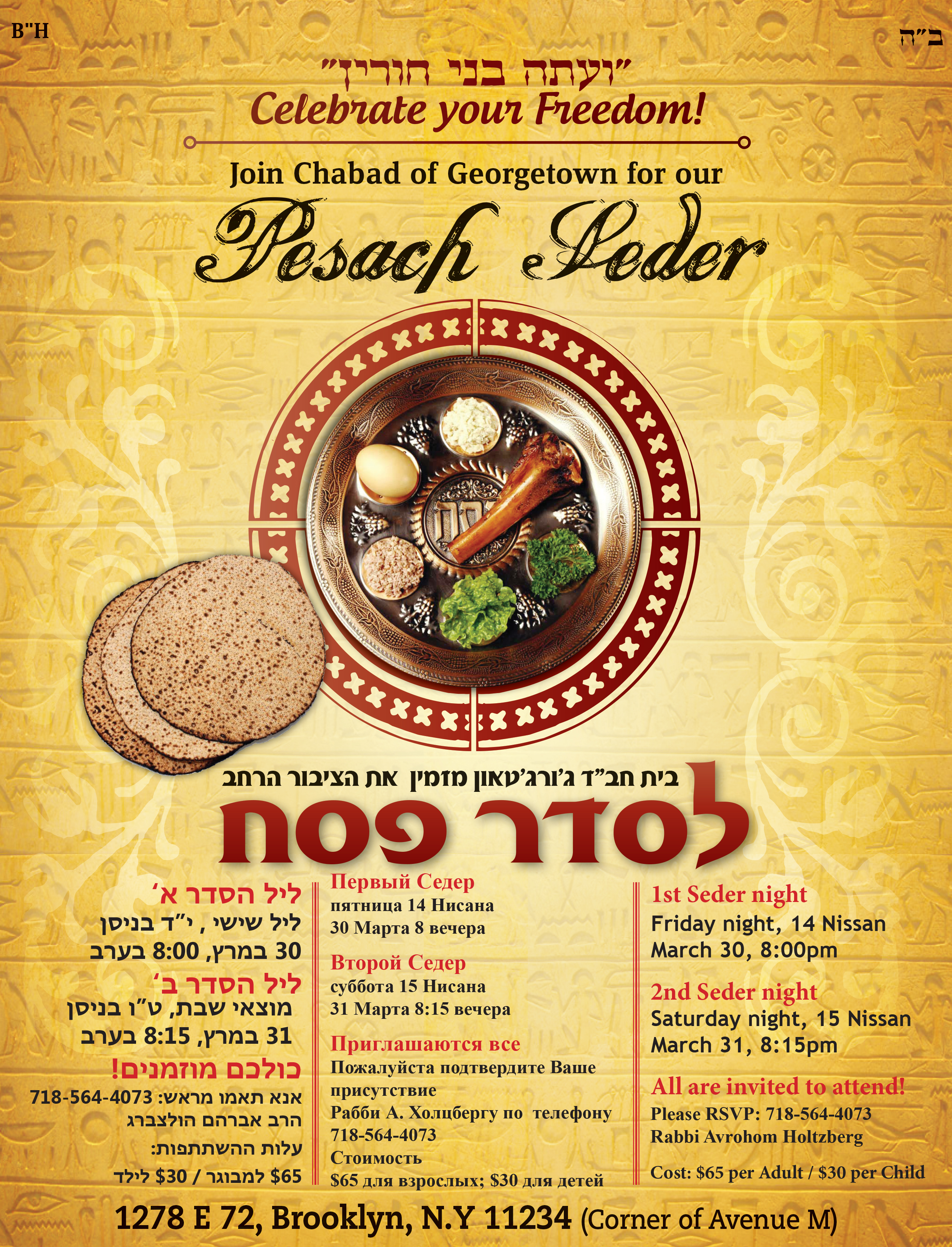 Friday, March 30, 2018, 8:00pm First Passover Seder Chabad of Georgetown