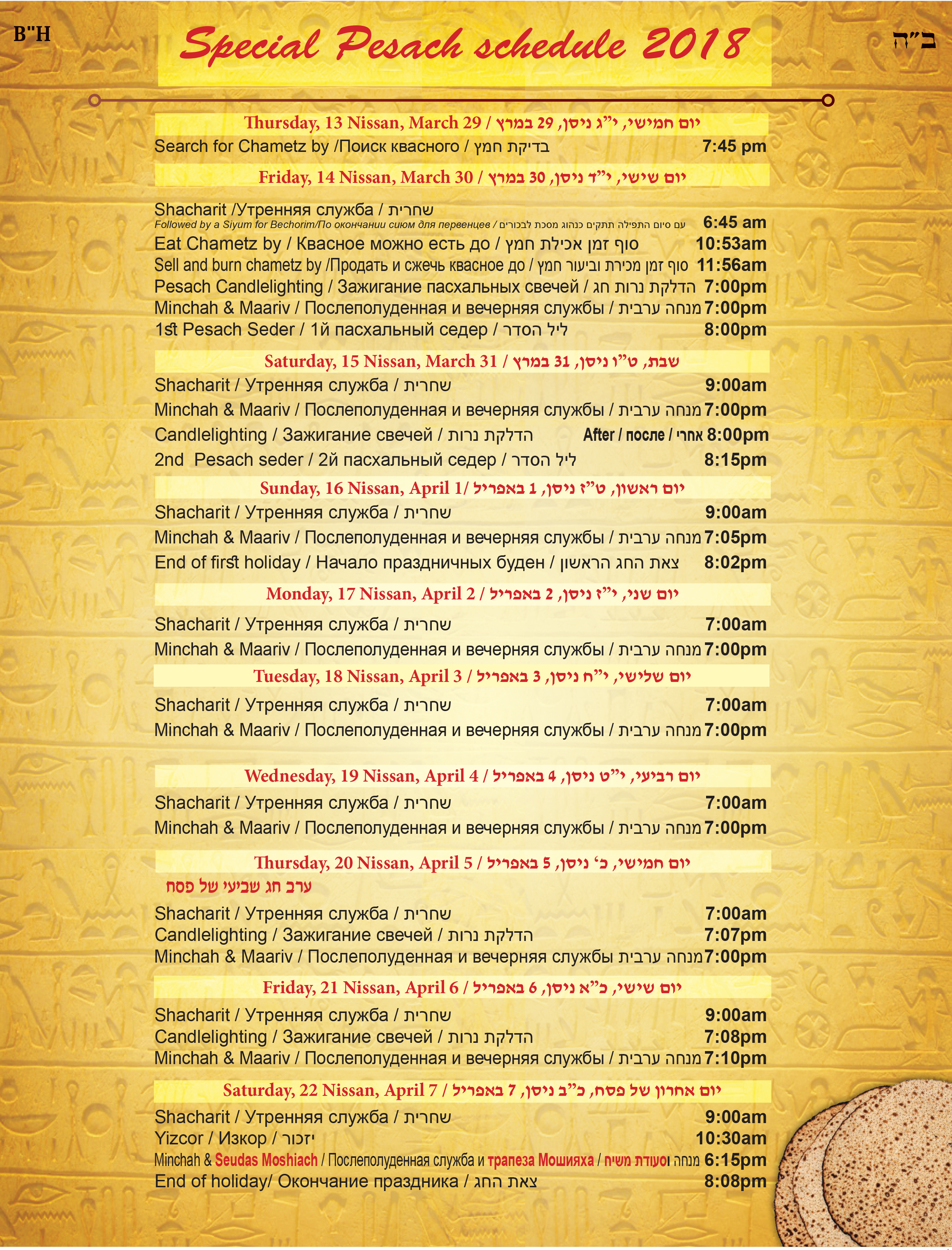 Rabbi Moshe Weiner, Director of the Kosher Information Center, will give a special detailed Dvar Halacha on the intricacies of the laws of Pesach.