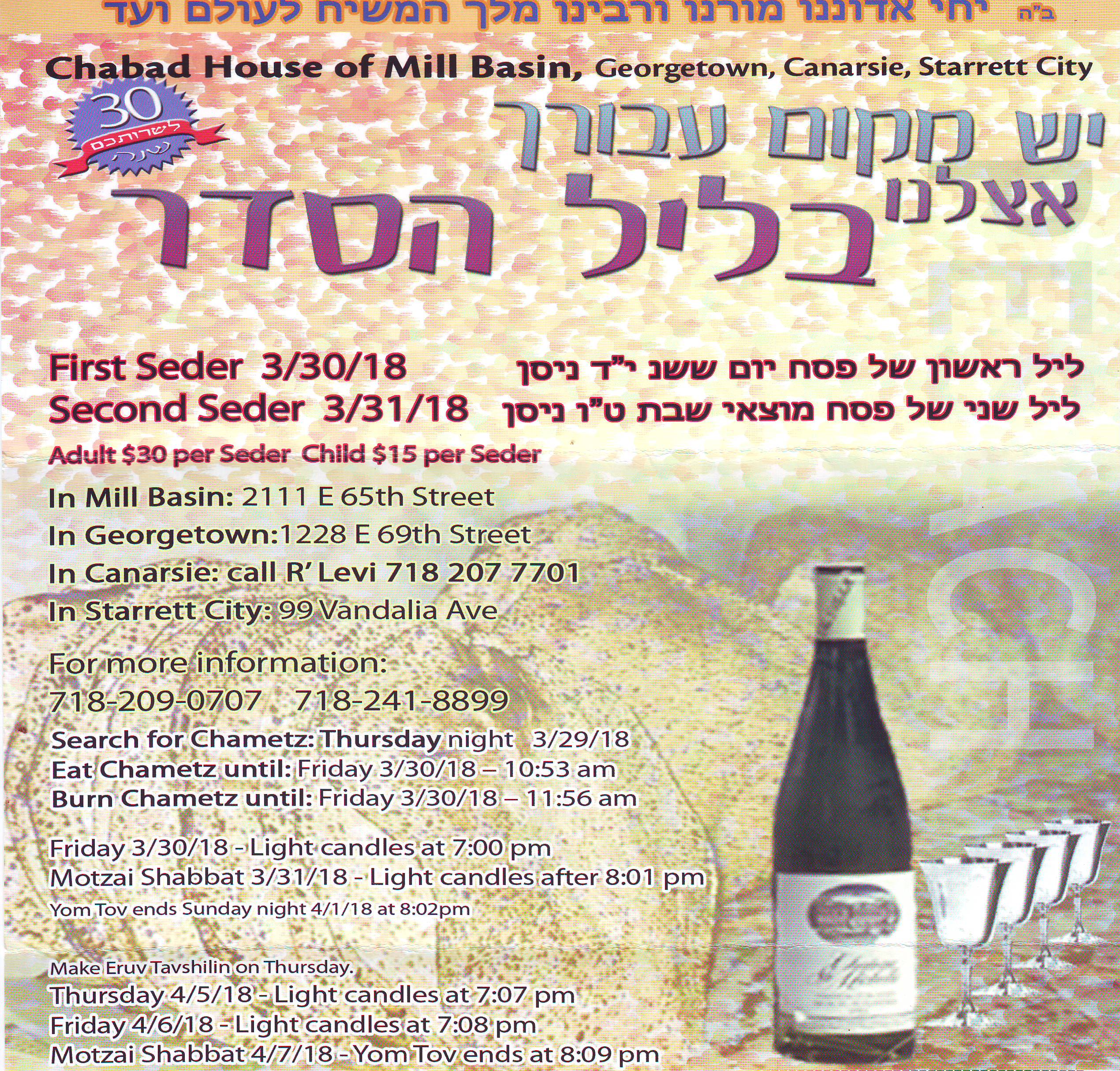 Saturday, March 31, 2018, 8:15pm Second Passover Seder Chabad of Georgetown