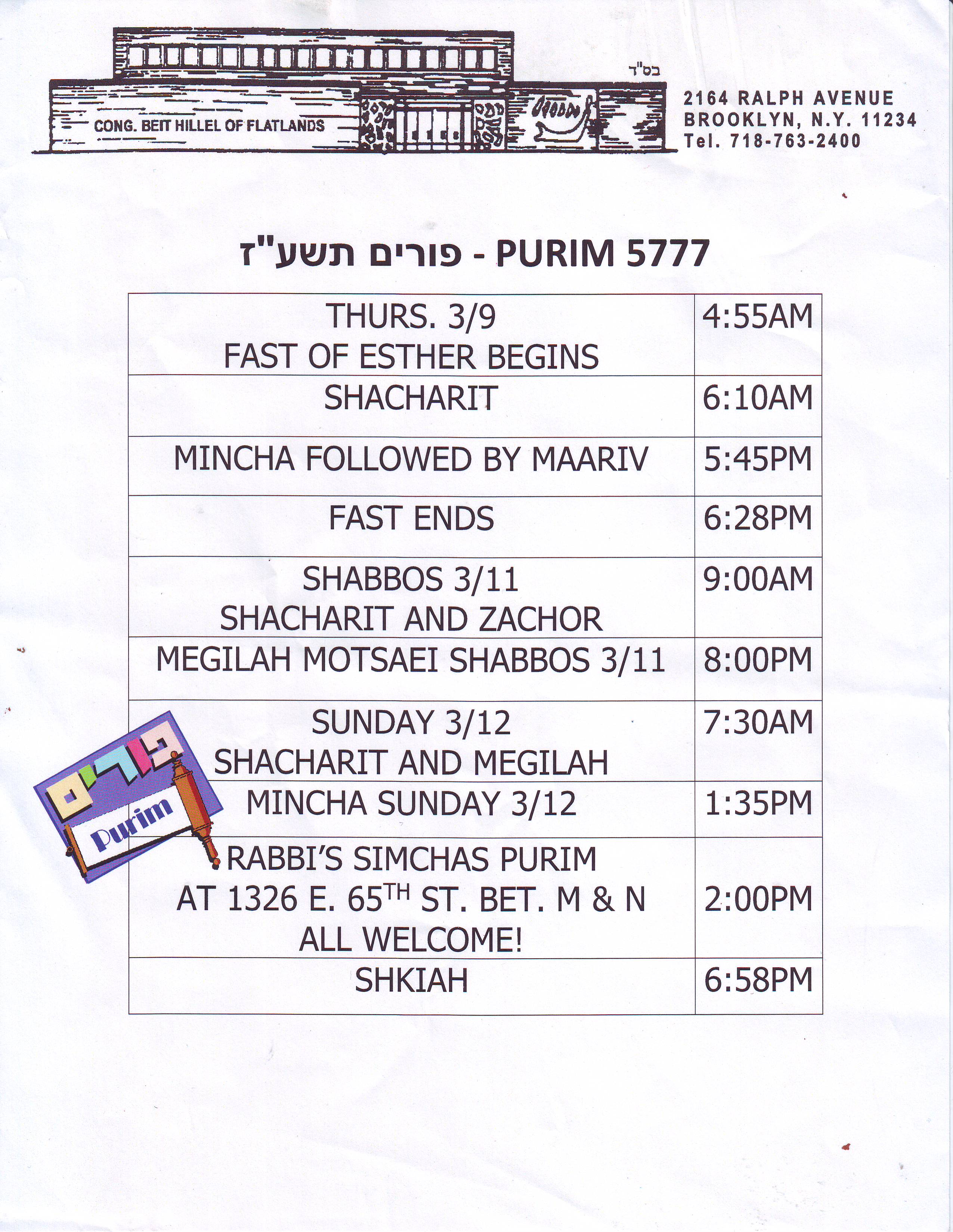 Sunday, March 12, 2017 Purim Day Schedule
