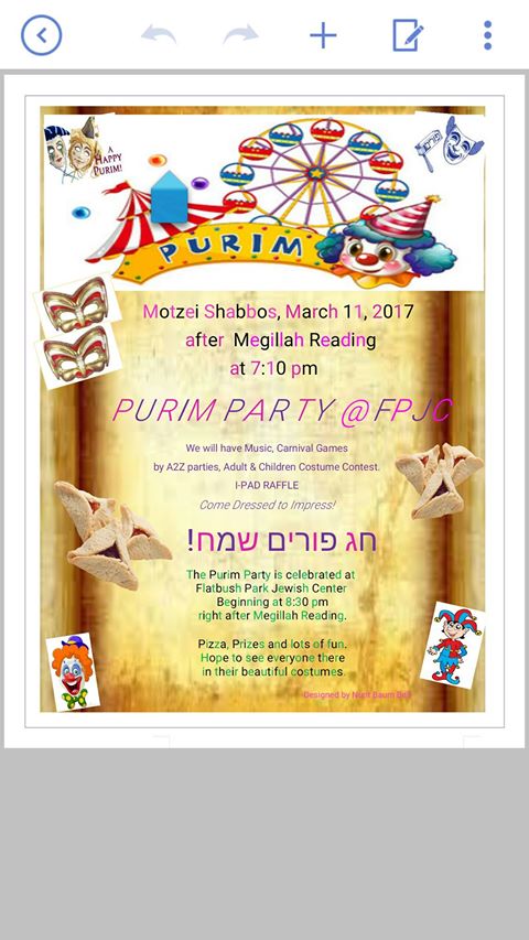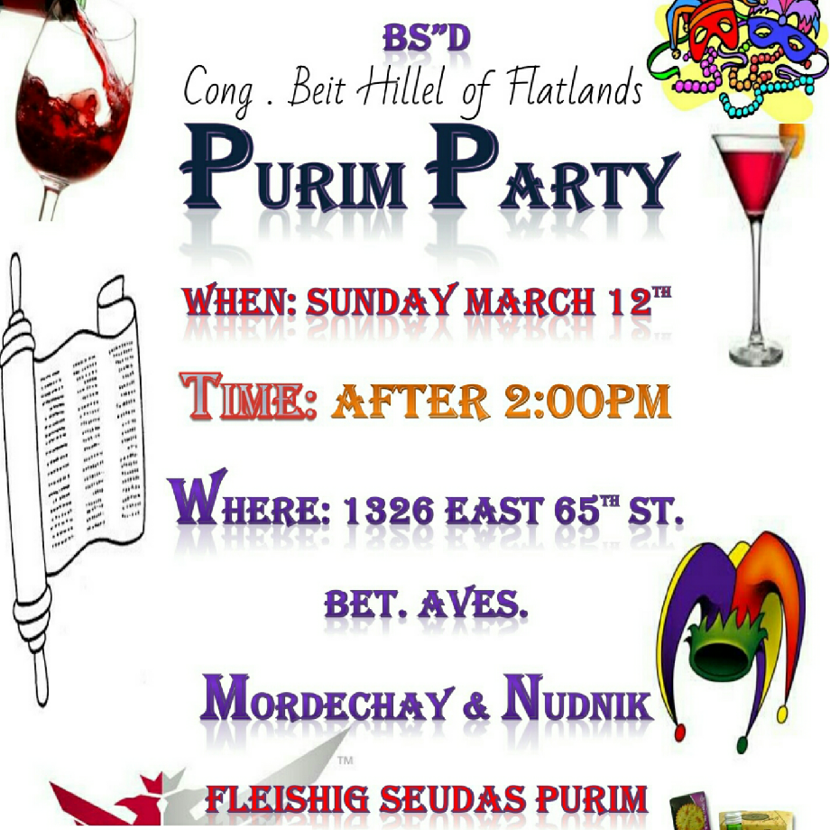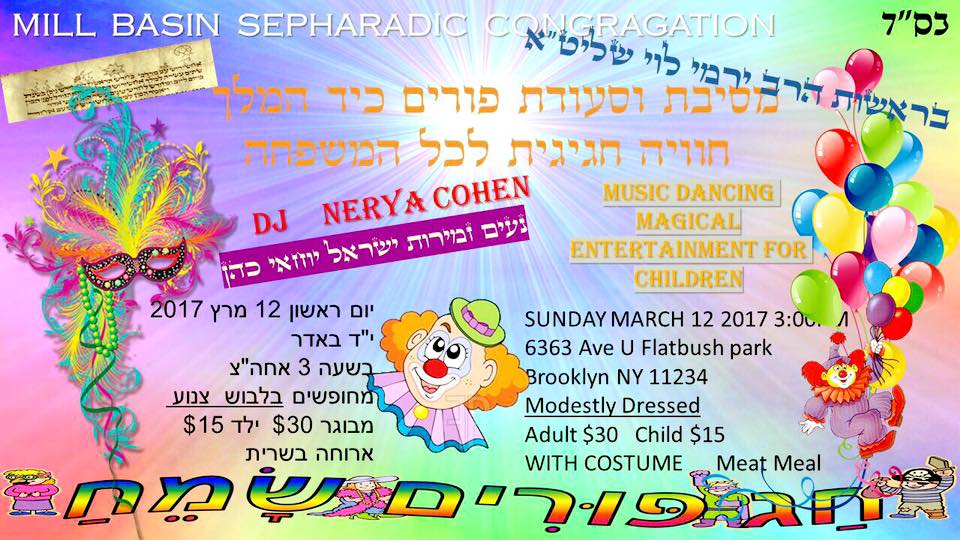 Saturday, March 11, 2017, 8:30pm Purim Party Flatbush Park Jewish Center