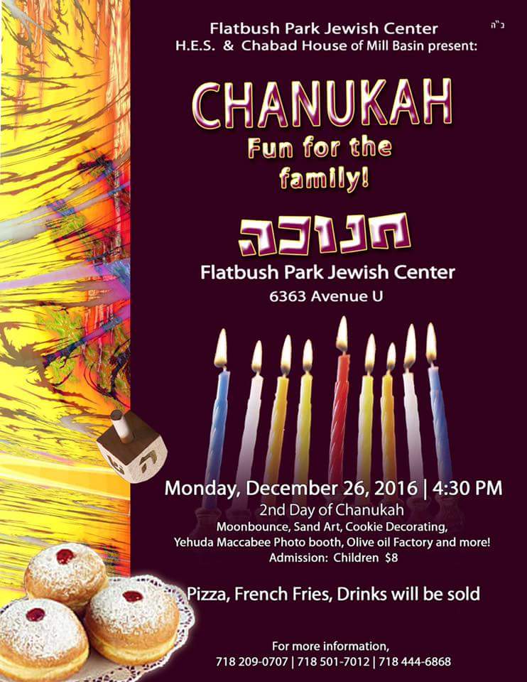 Monday, December 26, 2016, 4:30pm Family Chanukah Party Flatbush Park Jewish Center