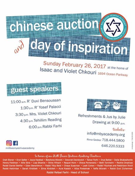 Sunday, February 26, 2017, 11:00am - 9:00pm MBYA Chinese Auction and Day of Inspiration