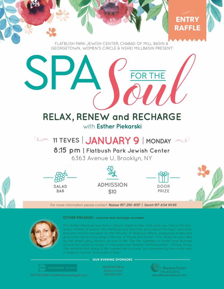 Monday, January 9, 2017, 8:15pm Spa for the Soul Flatbush Park Jewish Center