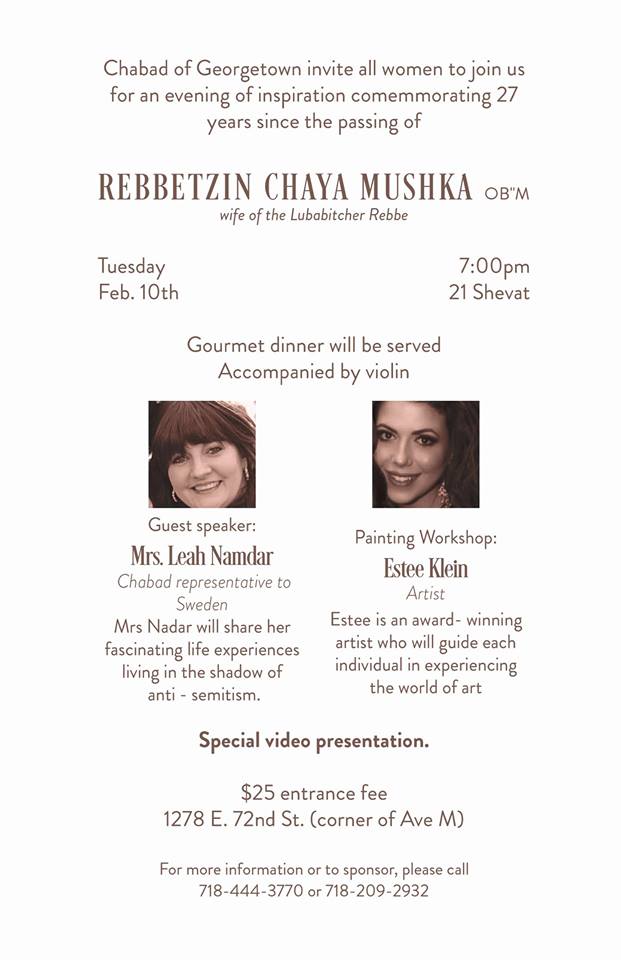 • Mrs. Leah Namdar, Chabad representative to Sweden, will share her experiences living in the shadow of anti-Semitism.