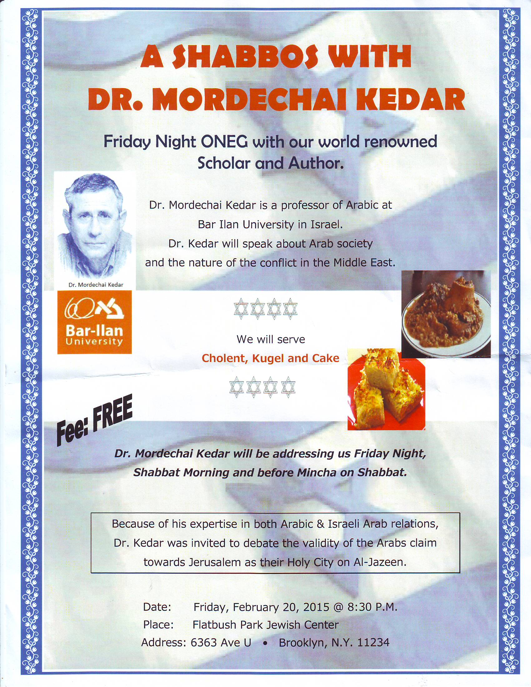 Dr. Mordechai Kedar, Professor of Arabic at Bar Ilan University and world renowned scholar and author, will speak about Arab society and the nature of the Middle East conflict.  He will speak Fri. night, Shabbat morning, and before Mincha on Shabbat.