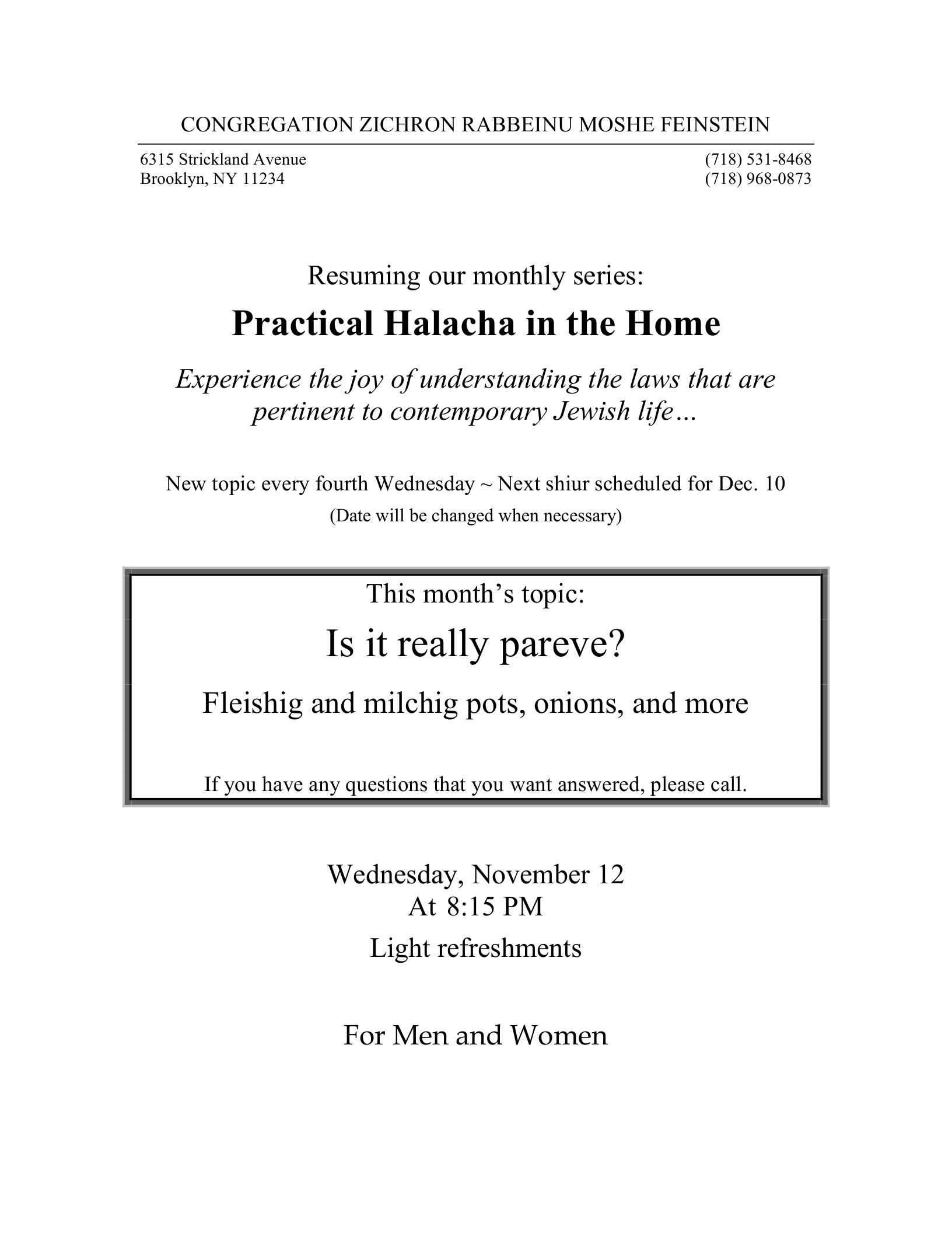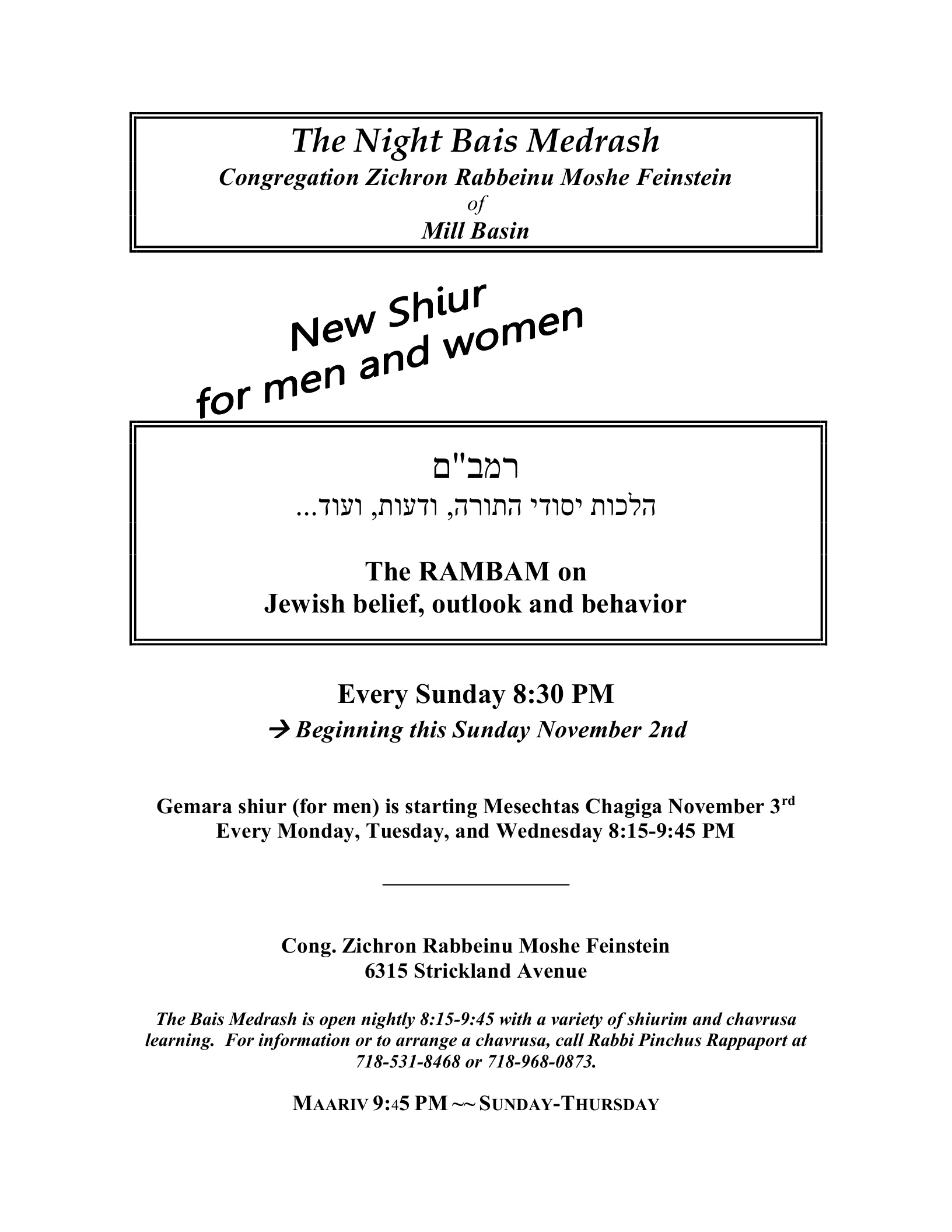 New weekly Shiur for men & women.