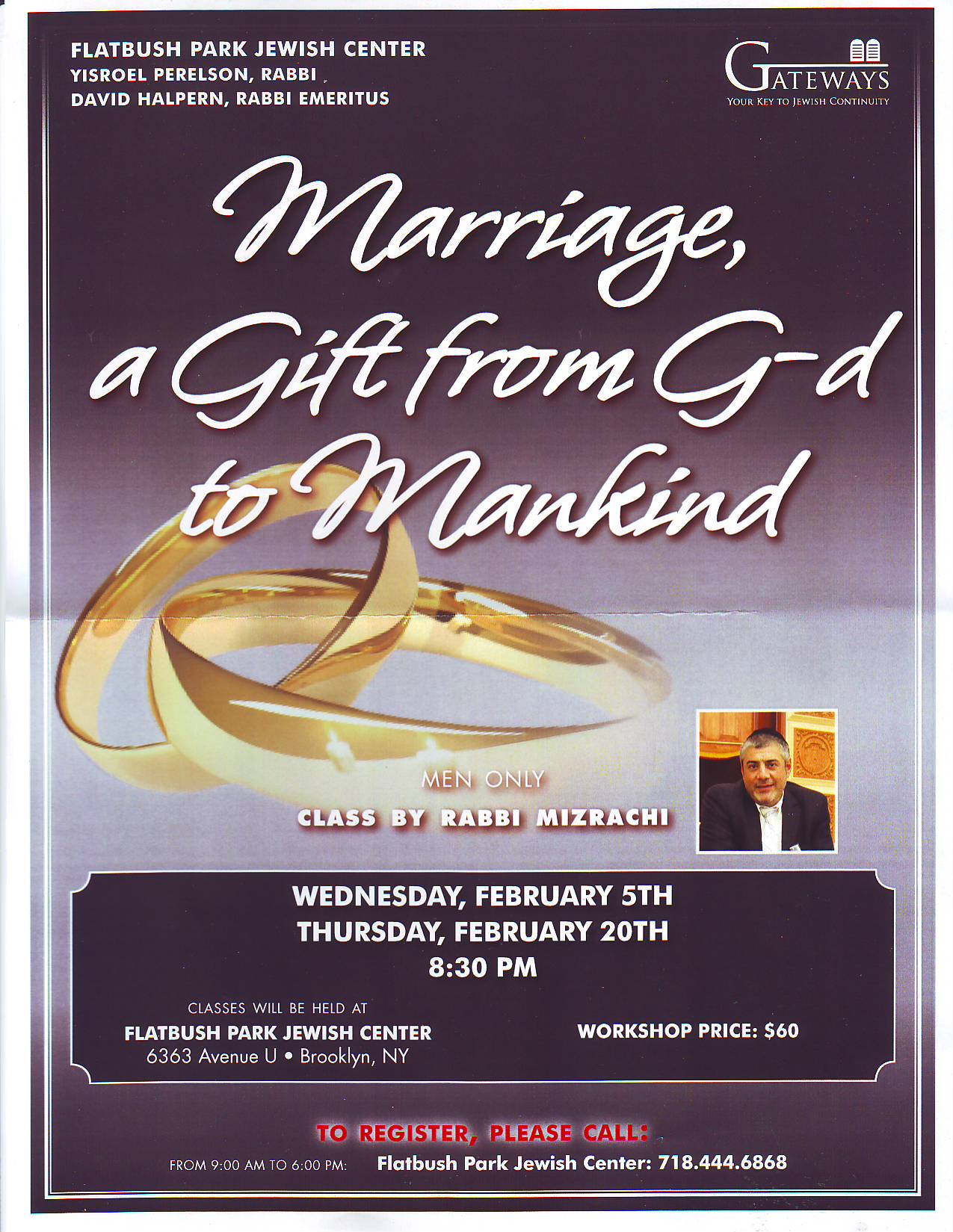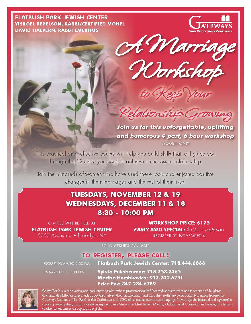 For info, call 718-444-6868, and leave a message for Rabbi Perelson.